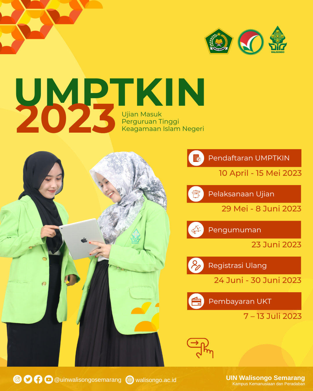 UIN Walisongo Online, Semarang – Universitas Islam Negeri Walisongo kembali membuka jalur Penerimaan Mahasiswa Baru (PMB) melalui Ujian Masuk Perguruan Tinggi Keagamaan Islam Negeri (UMPTKIN) tahun 2023. Sebanyak 1898 Kuota disediakan untuk para calon mahasiswa yang ingin kuliah di UIN Walisongo Semarang. UM-PTKIN merupakan pola seleksi yang dilaksanakan secara bersama oleh 58 PTKIN (UIN, IAIN,...Read More