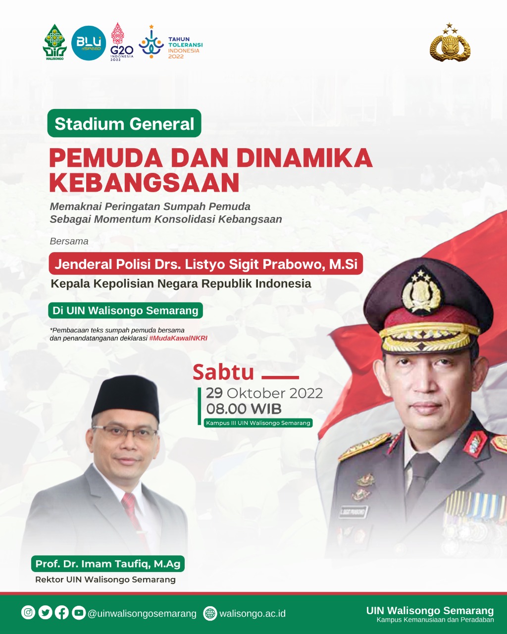 UIN Walisongo Online, Semarang – Kepala Kepolisian RI Jendral Polisi Drs. Listyo Sigit Prabowo, M.Si. memberikan orasi kebangsaan dalam kegiatan Studium General di Auditorium 2 Kampus 3 UIN Walisongo Semarang, Sabtu, 29 Oktober 2022. Di depan ribuan mahasiswa UIN Walisongo, Listyo hadir dengan pakaian setelan polisi serta mengenakan peci hitam. Jendral Bintang 4 ini menyampaikan...Read More