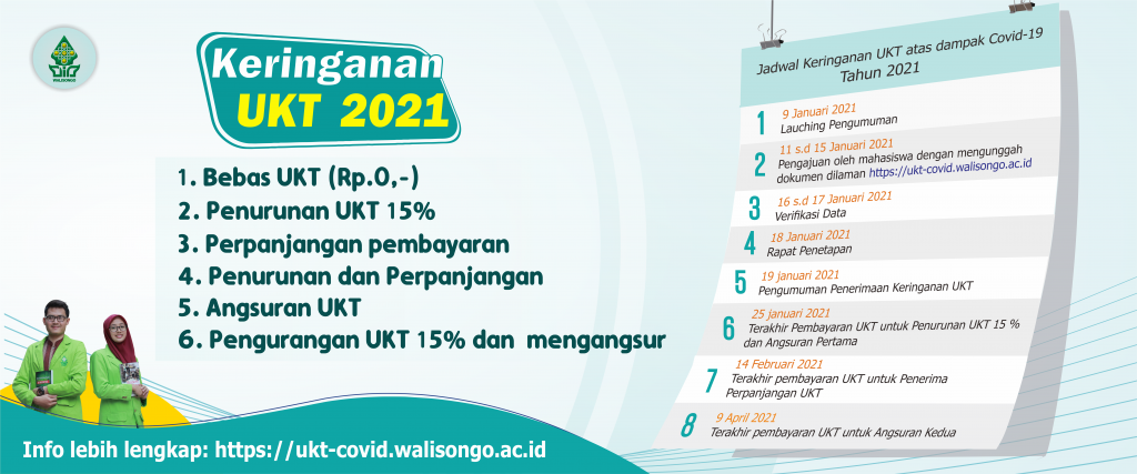 PENGUMUMAN Nomor : 317/Un.10.0/R2/PP.06/01/2021 Tentang KERINGANAN UANG KULIAH TUNGGAL ATAS DAMPAK BENCANA WABAH COVID-19 TAHUN 2021 Mempertimbangkan dampak pandemi CoVID-19, maka bersama ini disampaikan mekanisme Keringanan Uang Kuliah Tunggal bagi mahasiswa UIN Walisongo Semarang Tahun 2021 sebagaimana terlampir.Read More